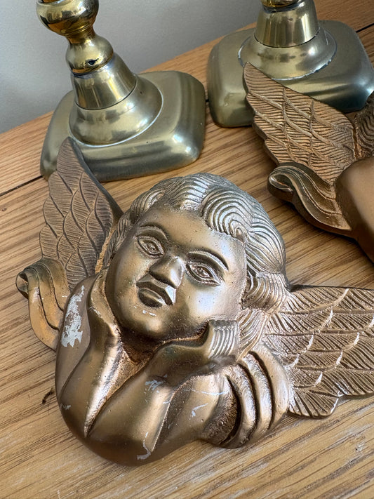 Pair of Metal wall hanging Cherubs Putti Angel Wings Shabby Gold