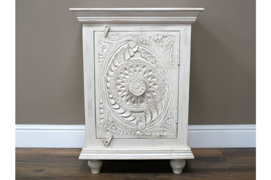 White Bohemian Carved Wooden Bedside Table cupboard storage