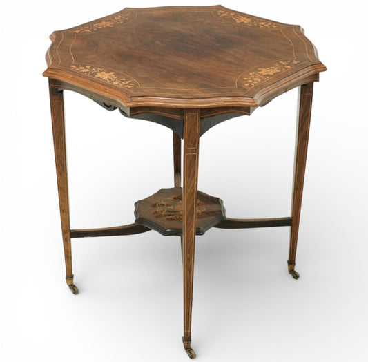 Edwardian inlaid rosewood centre table, octagonal top, square taper legs and undertier