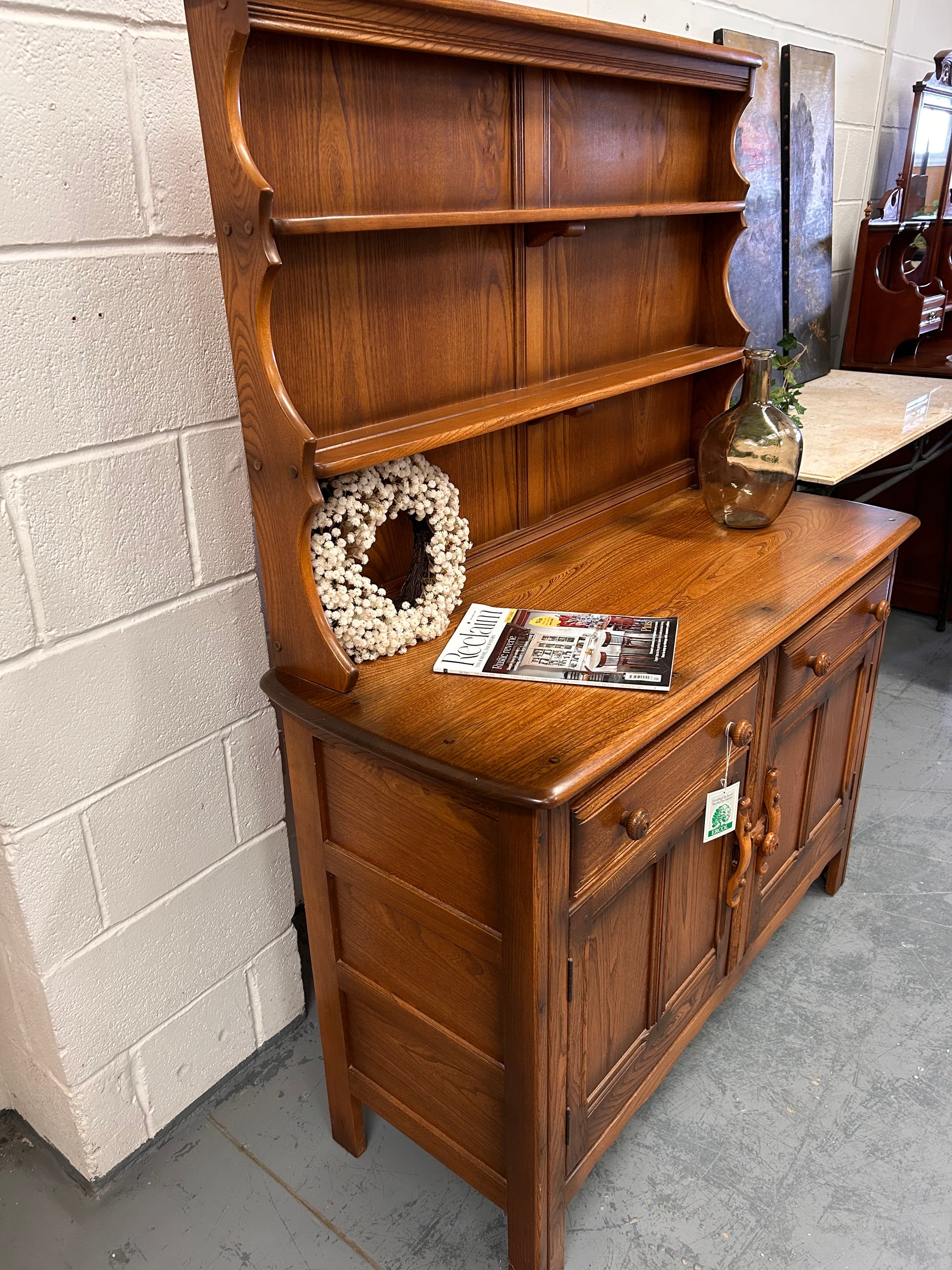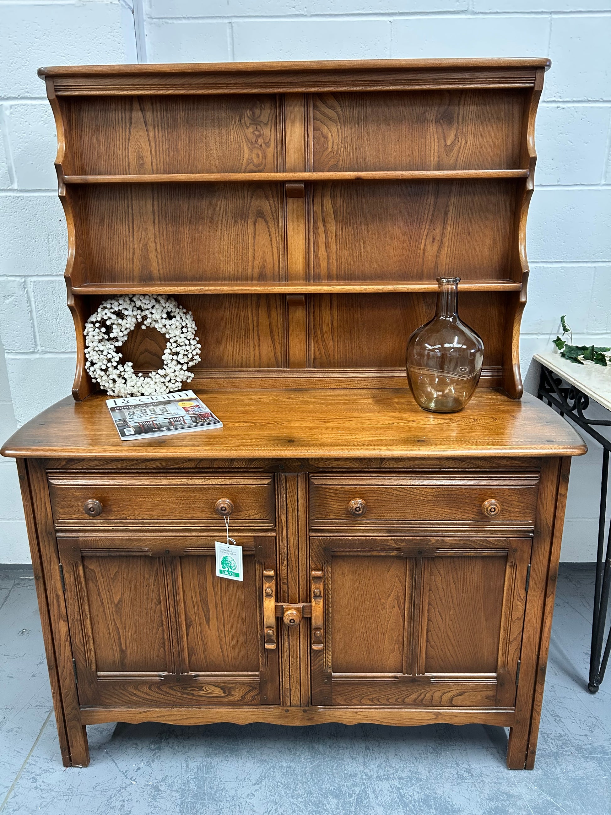 A vintage ERCOL dresser with two drawers over cupboards and the plate rack above.