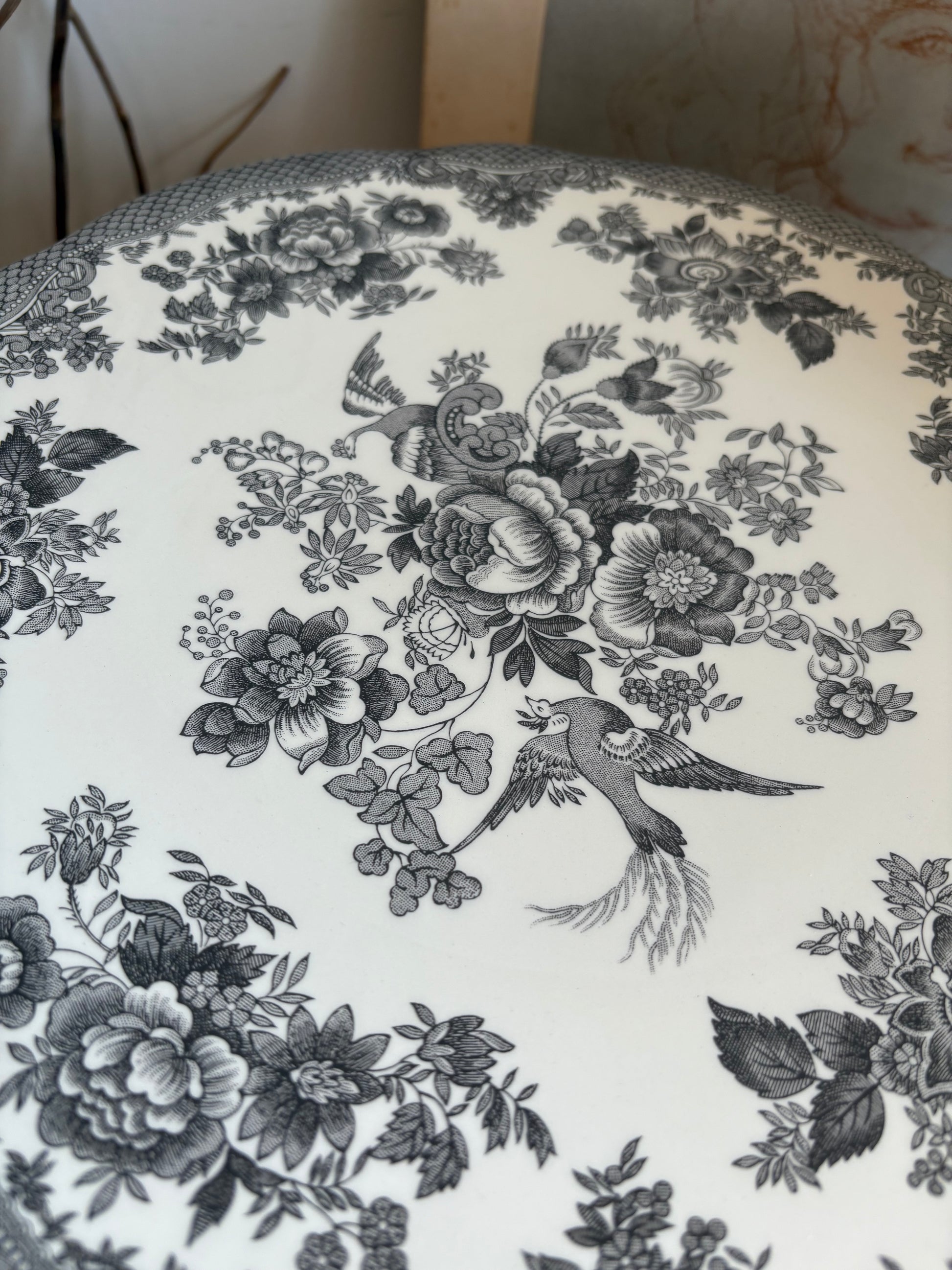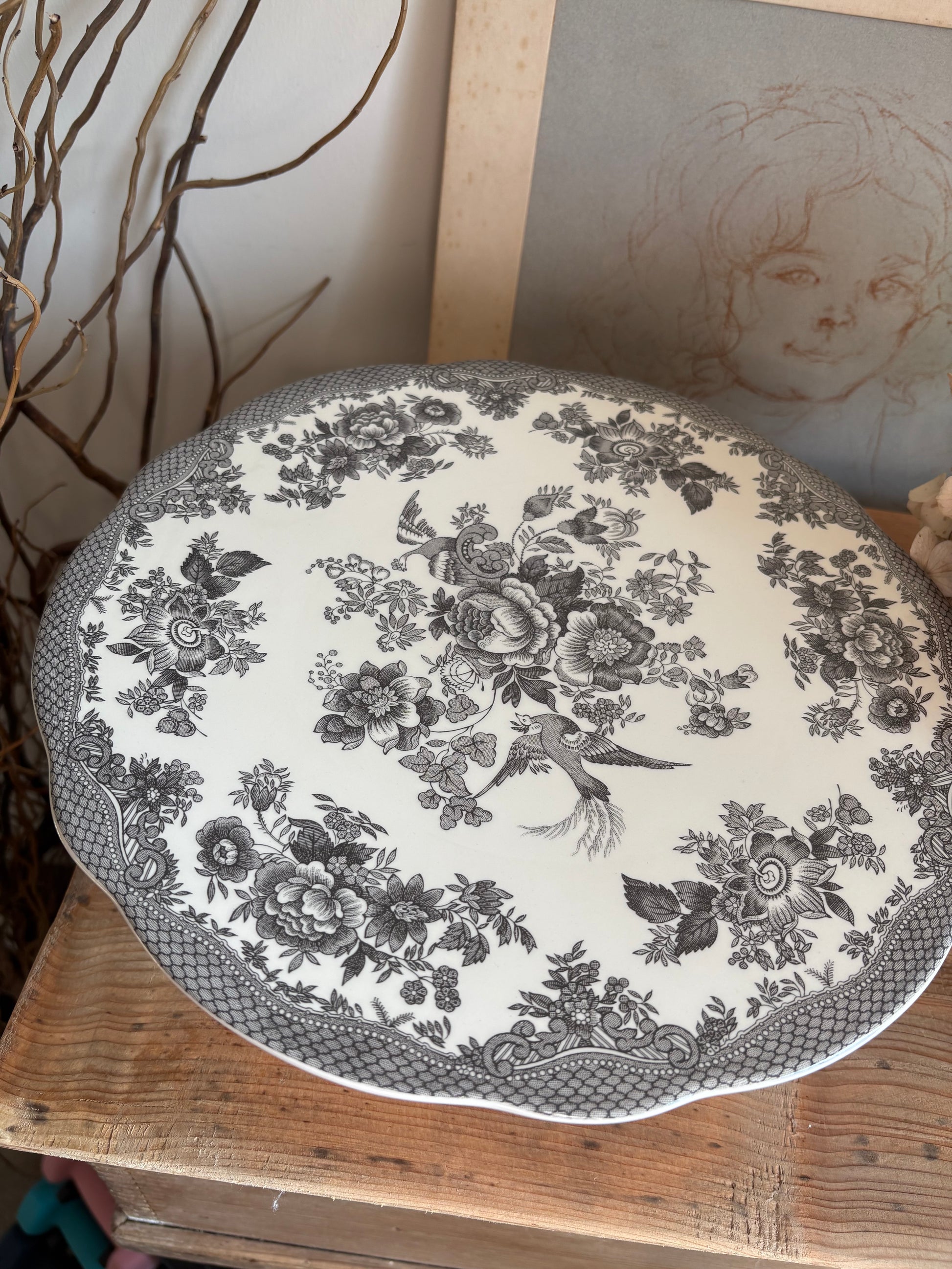 Charcoal and white vintage asiatic pheasant round cake stand