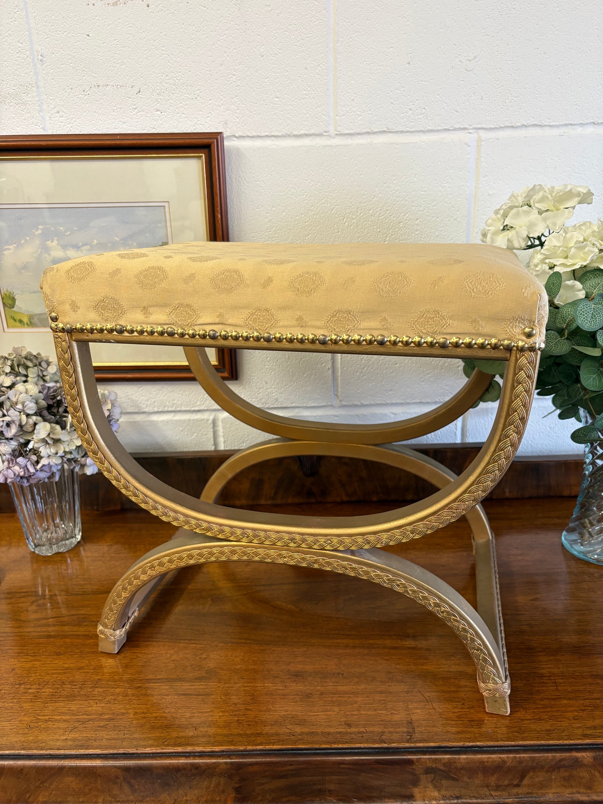 Vintage Regency Yellow Gold upholstered stool with a cross X Frame