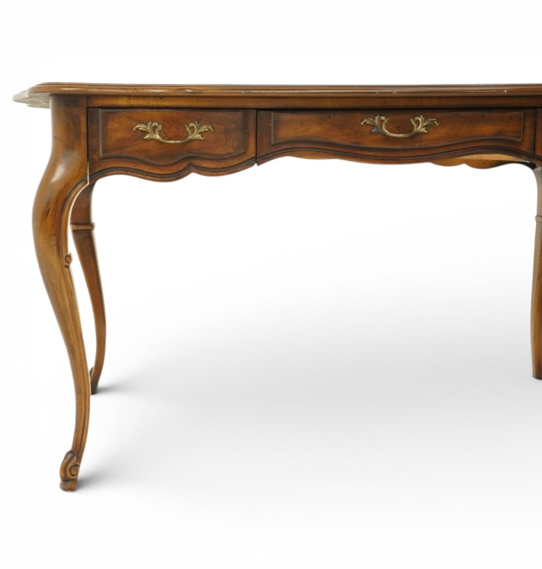 Vintage French walnut console table parquetry top & three drawers brass handles